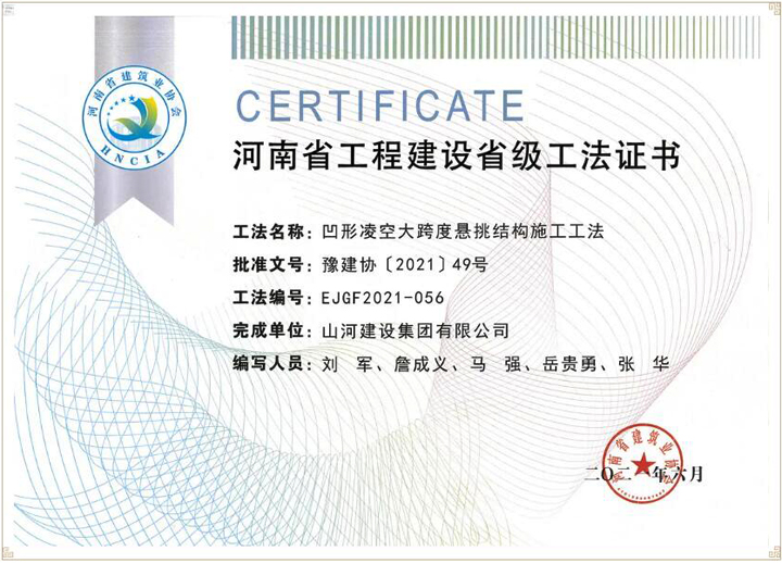 近日,河南省建筑业协会公布了《2021年度第一批河南省省级工法名单》,九游·体育(jiuyou.com)官方网站建设九游·体育(jiuyou.com)官方网站河南公司申报的《凹形凌空大跨度悬挑结构施工工法》成功入选,被认定为河南省工程建设省级工法。