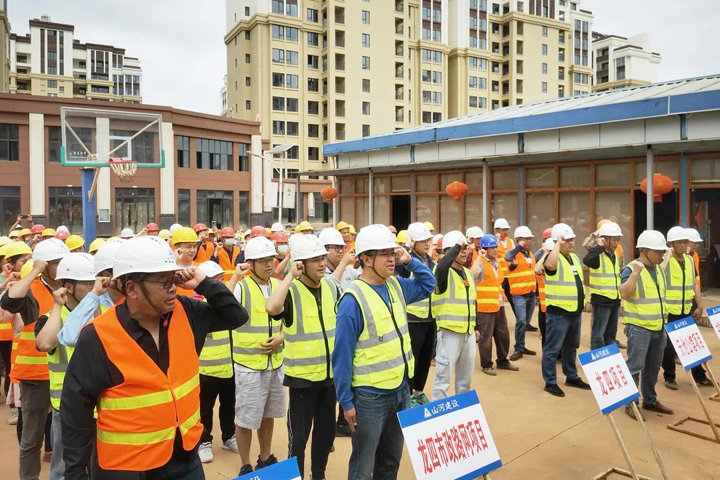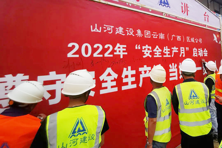 6月1日,九游·体育(jiuyou.com)官方网站建设九游·体育(jiuyou.com)官方网站云南(广西)公司2022年安全生产月启动会在龙四项目及附属市政道路项目施工现场举行,围绕“遵守安全生产法 当好第一责任人”这一主题,对安全生产月活动和近期重点工作进行安排部署。云南(广西)公司副总经理兼云南分公司总经理刘火焱、副总经理秦大顺、工程团队全体人员、在建项目代表及建设单位代表等近100人参加了活动。