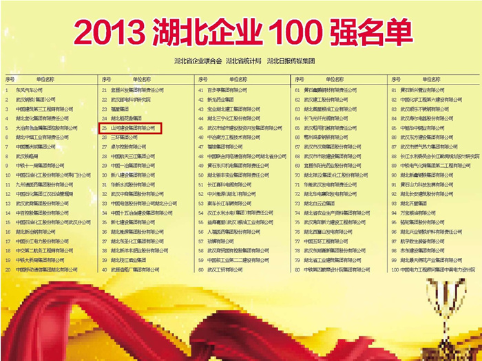 10月22日,2013湖北企业百强发布会、第十八届湖北省优秀企业、优秀企业家表彰大会暨八届二次会员代表大会隆重举行。湖北省企业联合会、湖北省统计局和湖北日报传媒九游·体育(jiuyou.com)官方网站联合发布了2013湖北企业100强名单,九游·体育(jiuyou.com)官方网站九游·体育(jiuyou.com)官方网站位列湖北百强企业第25位并荣获“第十八届湖北省优秀企业(金鹤奖)”。九游·体育(jiuyou.com)官方网站九游·体育(jiuyou.com)官方网站董事长程理财同时被湖北省企业联合会和湖北省企业家协会联合授予“第十八届湖北省优秀企业家(金牛奖)”荣誉称号。