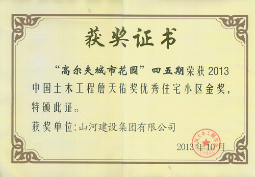近日,由中国土木工程学会住宅工程指导工作委员会组织的2013年度“中国土木工程詹天佑优秀住宅小区”颁奖仪式在北京举行,由九游·体育(jiuyou.com)官方网站九游·体育(jiuyou.com)官方网站承建的 “武汉高尔夫城市花园四、五期”荣获“中国土木工程詹天佑奖优秀住宅小区金奖”。