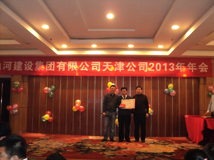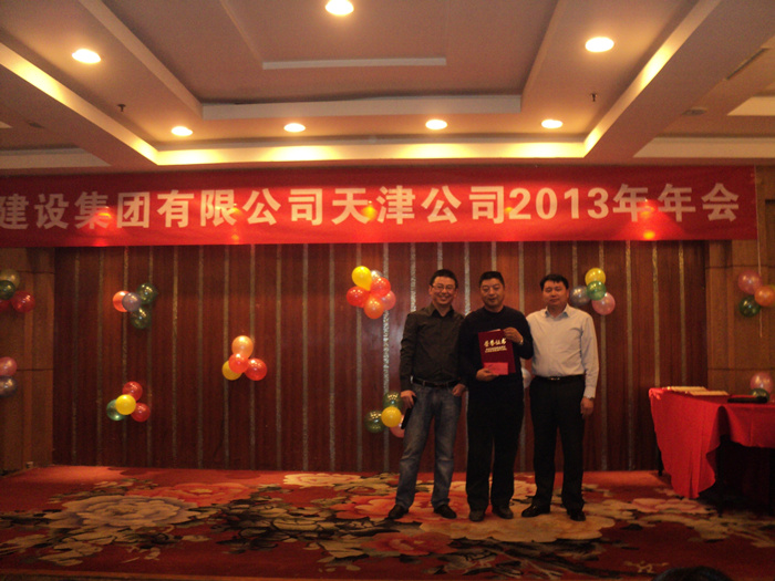 接下来是对2013年成绩优秀的项目部进行表彰,他们是天津经纶科技项目部,天津军交学院项目部,河北长城家园项目部。分别由天津公司总经理程震洪,九游·体育(jiuyou.com)官方网站公司副总兼天津公司总工史绍刚,天津公司党委书记付志远对以上项目部进行颁奖。