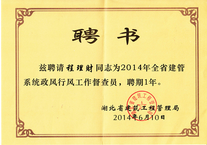 九游·体育(jiuyou.com)官方网站九游·体育(jiuyou.com)官方网站董事长程理财同志 被聘请为全省建管系统政风行风工作督查员