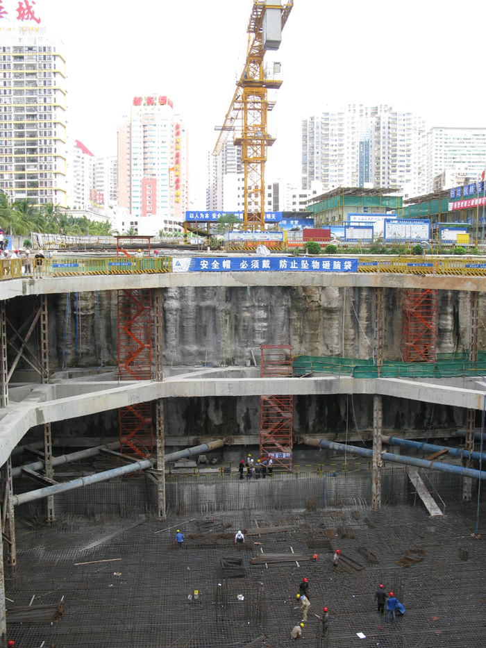 南洋国际公馆项目基坑形状呈“口”字形,边长约62m,基坑周长约236m,基坑开挖面积约3811m2,建筑占地面积约3669 m2,建筑面积约38759.7m2,基坑开挖深度为22.05m,局部电梯井挖深23.15m。该工程地上25层,地下结构2层(6夹层),是目前海南在建最深、层数最多的基坑工程。