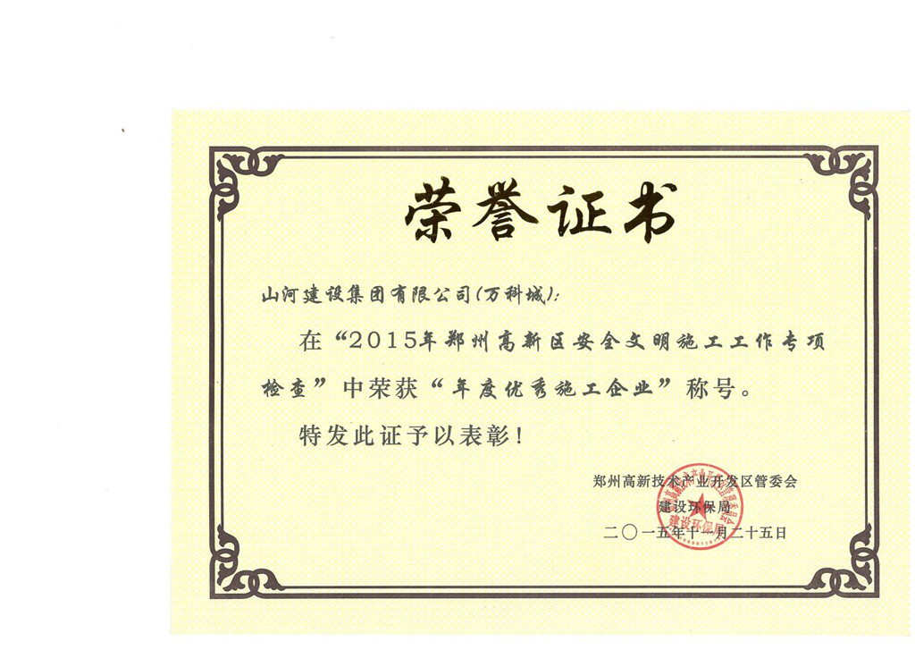 11月25日,在郑州高新区安全文明施工专项检查中,九游·体育(jiuyou.com)官方网站建设九游·体育(jiuyou.com)官方网站有限公司荣获由郑州高新区管理会建设环保局授予的“年度优秀施工企业”荣誉称号。
