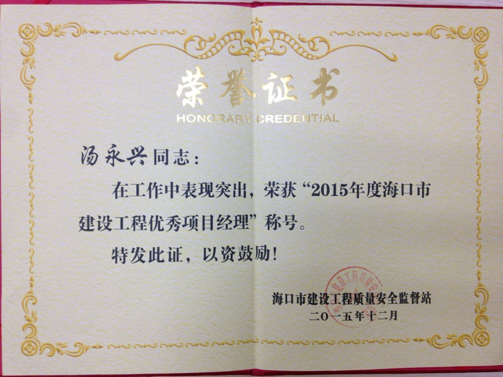 [海南公司]海南新城吾悦广场项目经理汤永兴荣获海口市“优秀项目经理”称号