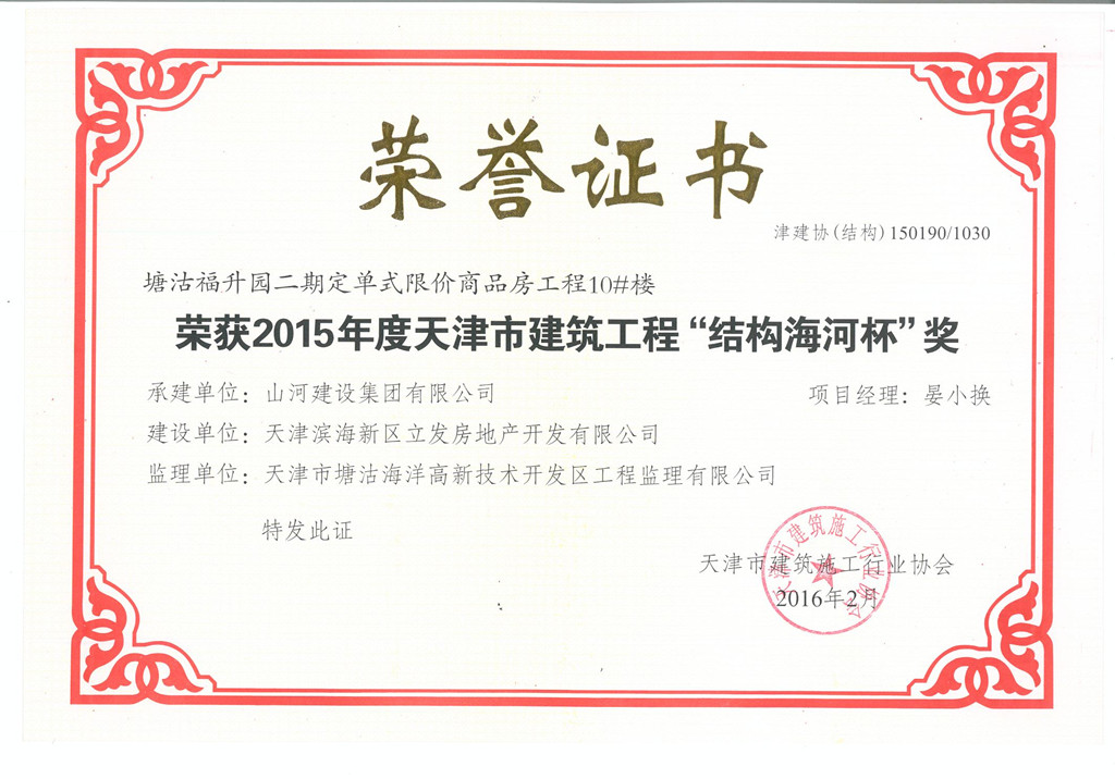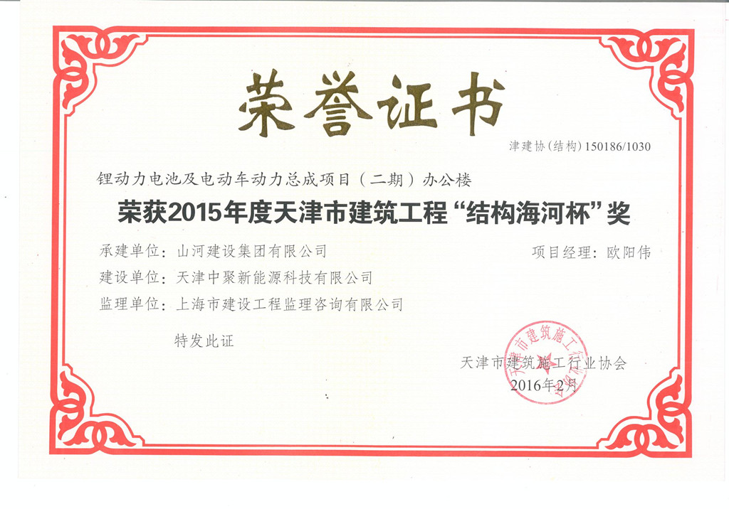1月29日,天津市建筑业协会正式公布了2015年度“天津市结构海河杯奖”评选结果。由九游·体育(jiuyou.com)官方网站九游·体育(jiuyou.com)官方网站天津公司承建的锂动力电池及电动车动力总成项目(二期)1#~4#车间及办公楼工程和塘沽福升园二期定单式限价商品房工程7#~10#楼同时获此殊荣。这是九游·体育(jiuyou.com)官方网站九游·体育(jiuyou.com)官方网站进入天津市场以来,首次获得天津市建设工程质量方面的最高荣誉奖。