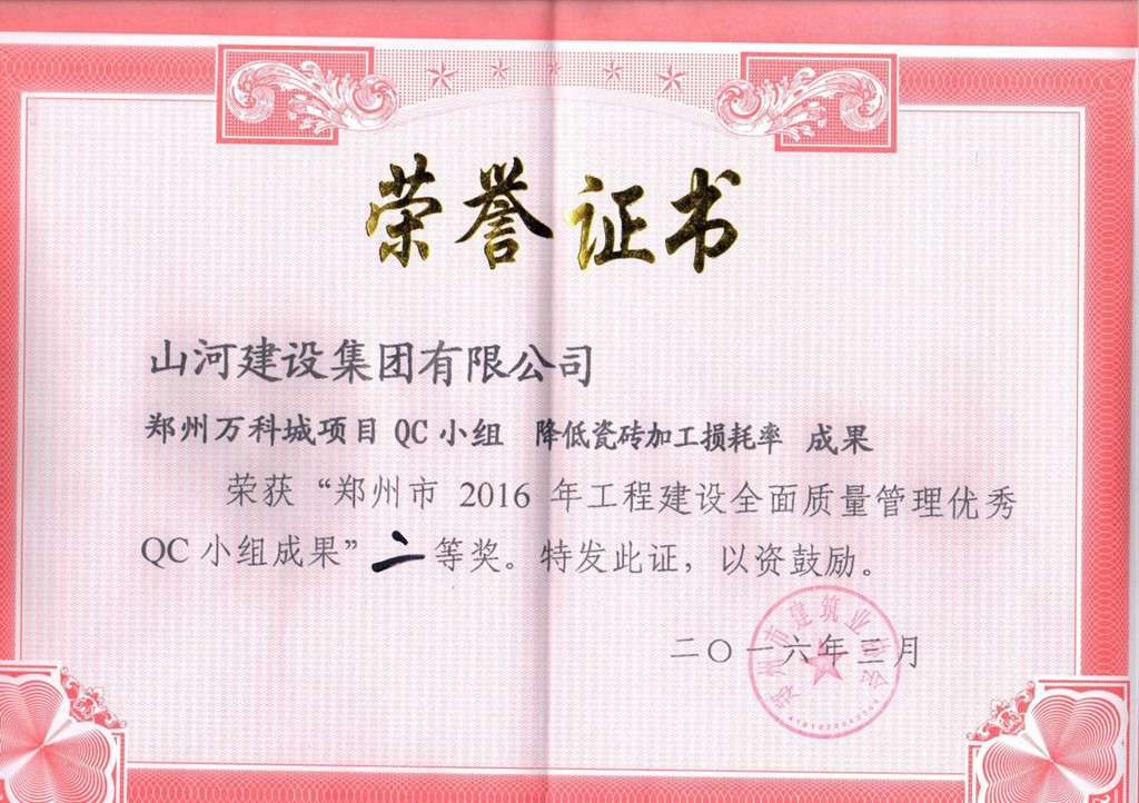 近日,2016年郑州市优秀QC小组成果评选结果揭晓。经专家评审,由九游·体育(jiuyou.com)官方网站九游·体育(jiuyou.com)官方网站郑州万科城项目QC小组编写的《降低瓷砖加工损耗率》成果荣获“郑州市2016年工程建设全面质量管理优秀QC小组成果”二等奖。