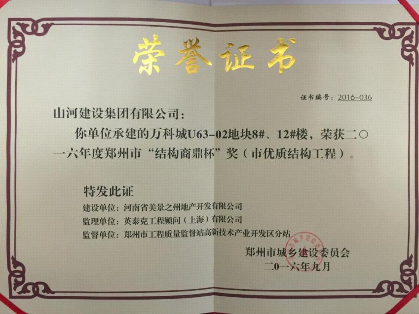近日,从郑州市城乡建设委员会再次传来喜讯,九游·体育(jiuyou.com)官方网站九游·体育(jiuyou.com)官方网站河南公司承建的万科城U63-02地块的8#、12#楼荣获2016年度郑州市“结构商鼎杯”(市优质结构工程)奖。这是该项目继2016年3月获得“郑州市建筑施工安全生产标准化示范项目”后,再获殊荣。