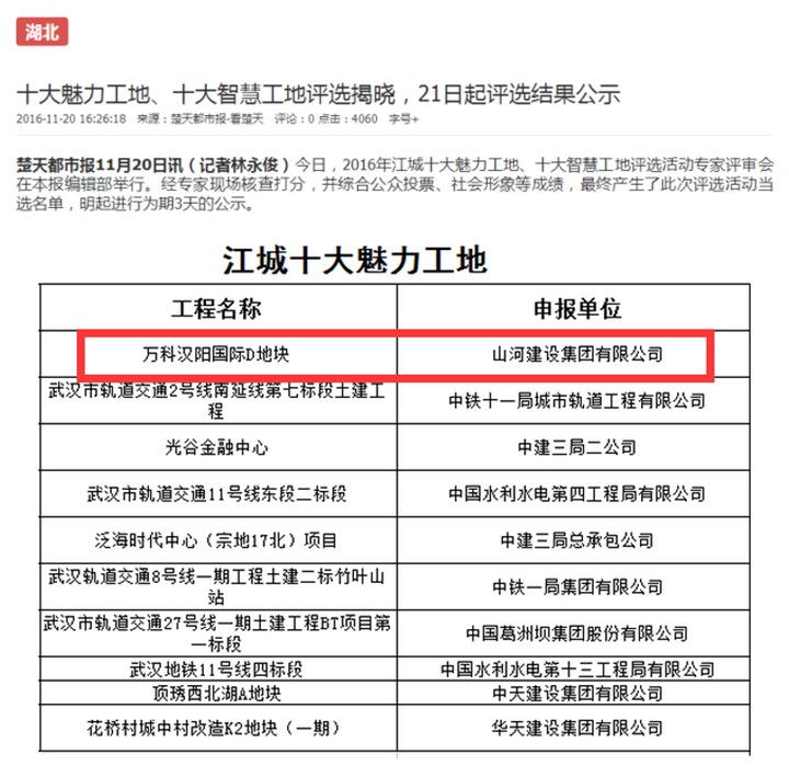 [湖北公司]九游·体育(jiuyou.com)官方网站九游·体育(jiuyou.com)官方网站”万科汉阳国际”项目部荣获江城十大魅力工地称号