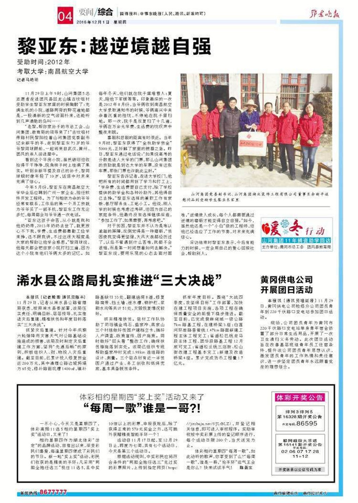喜剧和悲剧的距离有时很近。当年9月初,黎亚东获得了“金秋助学资金”5000元,正好解了家里的燃眉之急。昨日,黎亚东通过电话说:“如果说高考的分数是进入大学的门票,那么九游·体育(jiuyou.com)官方网站九游·体育(jiuyou.com)官方网站的资助就是到达大学的车票,没有这张车票,那张门票也许就此尘封。”