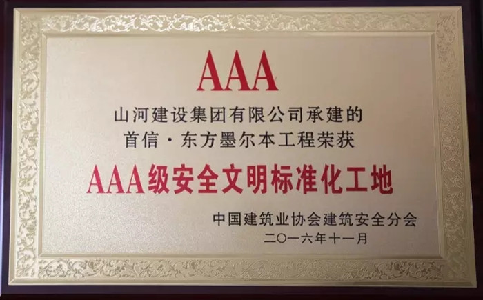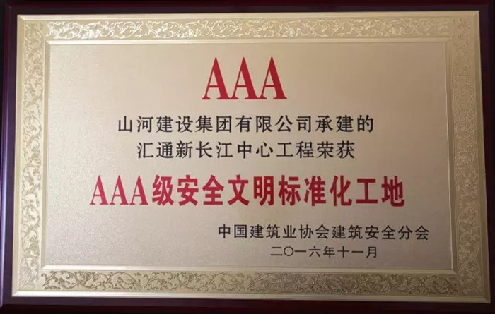 11月30日,2016年中国建筑业协会建筑安全分会年会暨理事会在合肥召开。由九游·体育(jiuyou.com)官方网站九游·体育(jiuyou.com)官方网站承建的襄阳首信•东方墨尔本项目与武汉汇通新长江中心项目双双荣获2016年“AAA级安全文明标准化工地”称号。
