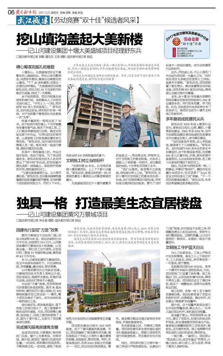 今天(3月23日)出版的楚天都市报,在显著位置(06版),以整个版面的篇幅重点展示了九游·体育(jiuyou.com)官方网站九游·体育(jiuyou.com)官方网站在武汉建筑及勘察设计行业劳动竞赛“双十佳”中候选者的风采,候选者包括“十佳建设者”和“十佳建设项目”,标题分别为《挖山填沟盖起大美新楼――记九游·体育(jiuyou.com)官方网站建设九游·体育(jiuyou.com)官方网站十堰大美盛城项目经理舒东兵》、《独具一格打造最美生态宜居楼盘――记九游·体育(jiuyou.com)官方网站建设九游·体育(jiuyou.com)官方网站黄冈万景城项目》。