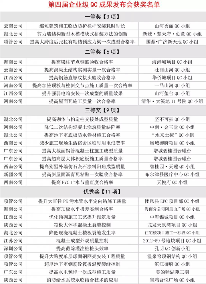 经过专家组综合评审,《缩短建筑施工临边防护栏杆安装耗时时长》等3项成果荣获一等奖,《提高梁柱节点钢筋验收合格率》等6项成果荣获二等奖,《提高砌体与构造柱交接处成型质量》等9项成果荣获三等奖,《提升大直径PE污水管水平定向钻施工质量》等11项成果荣获优秀奖。