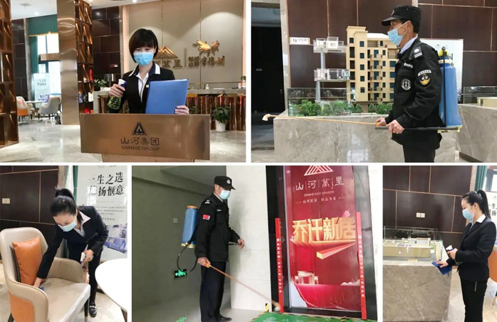 2.从停车场到前台、售楼处沙盘、接待区、办公室等公共区域每天进行两次全方位、零死角的消毒处理,小到门把手、桌椅板凳等也不放过,通过高频次的消毒,降低交叉感染风险,不留安全隐患。