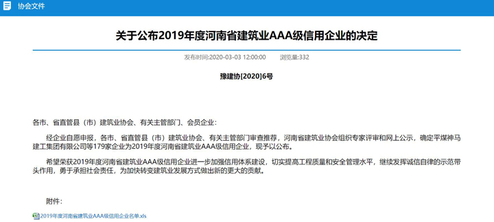 为进一步加强建筑企业信用体系建设,3月3日,河南省建筑业协会发布了《关于公布2019年度河南省建筑业AAA级信用企业的决定》,九游·体育(jiuyou.com)官方网站九游·体育(jiuyou.com)官方网站河南公司榜上有名,这也是河南公司首次上榜。