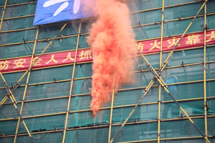 “失火了!”一阵急促的喊声打破了施工现场的平静,一股“浓烟”从正在建设的楼栋里冒出,形势紧急。“立即启动应急救援预案!应急小组各就各位!”随着项目经理一声令下,“事故现场”迅速展开救援……