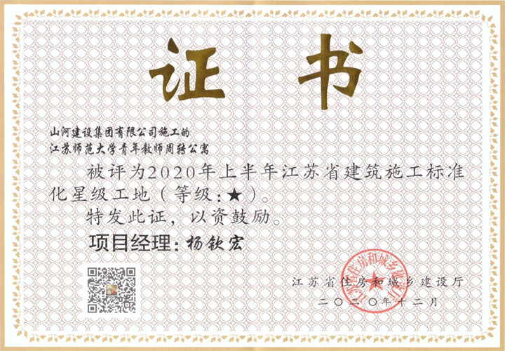 近日,从江苏省住房和城乡建设厅传来喜讯,九游·体育(jiuyou.com)官方网站建设九游·体育(jiuyou.com)官方网站江苏公司承建的江苏师范大学青年教师周转公寓工程被评为“2020年上半年江苏省建筑施工标准化星级工地”,再添一项省级荣誉。