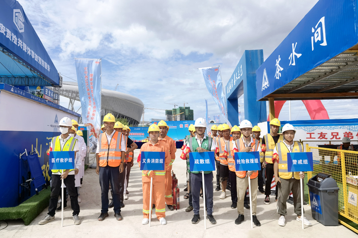 6月9日,九游·体育(jiuyou.com)官方网站建设九游·体育(jiuyou.com)官方网站海南公司承建的万宁红星美凯龙三标段项目施工现场人头攒动,万宁市2021年安全生产月启动仪式暨安全应急演练现场观摩会在这里举行。万宁市住房和城乡建设局局长陈云锋,建设工程质量安全监督站站长严云,安委办主任、应急管理局局长林靖等领导出席活动,海南公司常务副总经理程智、工程团队、项目管理人员及建设单位、监理单位、万宁市各在建项目代表等300余人参加了活动。
