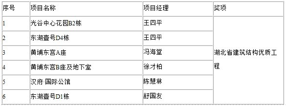 2008年4月9日,《湖北日报》第六版专版刊登《湖北省建设工程质量安全协会公告》。根据《湖北省建筑结构优质工程评审办法》,湖北省建设工程质量安全协会组织开展了2007年度省建筑结构优质工程评选活动,经对申报工程初审、核查和省建筑优质工程评审,全省有323项工程荣获2007年度湖北省建筑结构优质工程奖,其中,九游·体育(jiuyou.com)官方网站九游·体育(jiuyou.com)官方网站有光谷中心花园、东湖壹号、黄埔东宫、汉府・国际公馆等6项工程获此奖项。具体如下表: